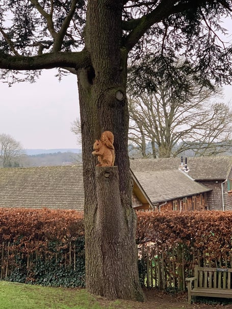 In July 2021, a barn owl was carved into the remains of the horse chestnut tree. And then in January 2022, a red squirrel was carved into the remains of a blue cedar.